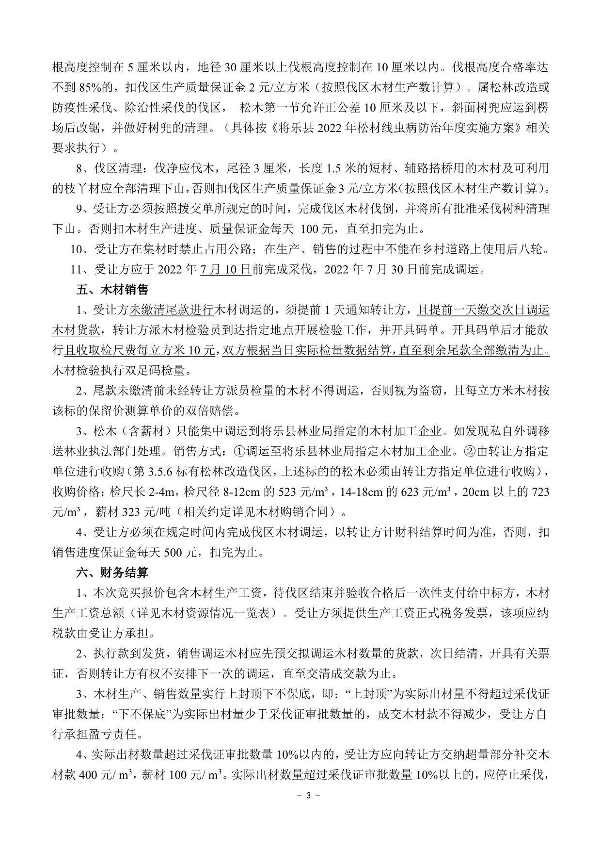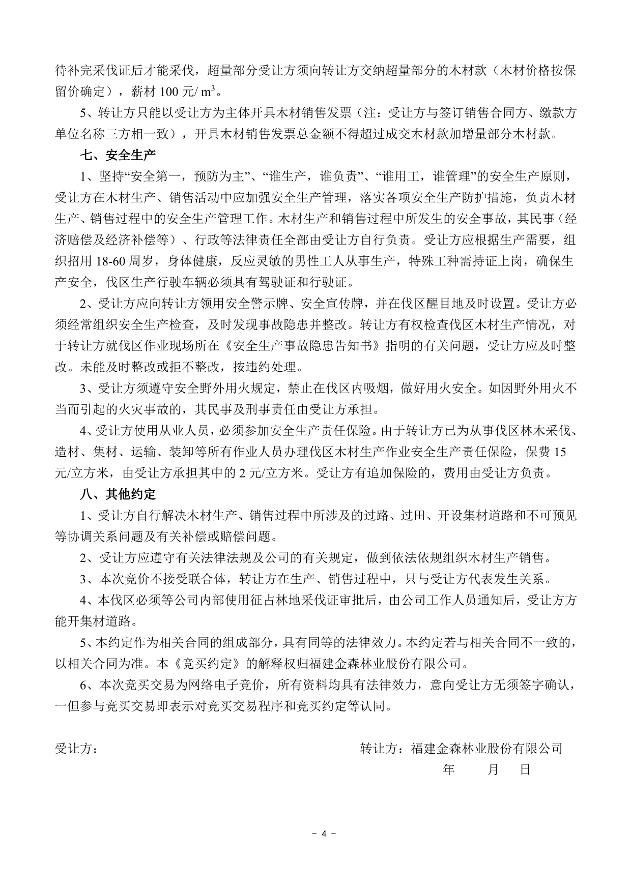 成交確認、價款支付及合同簽訂 | 1 .成交后的兩個工作日內受讓方以微信、郵箱等方式收到《成交通知書》掃描件或電話通知;若受讓方未及時收到成交通知書的,請主動與轉讓方聯系。 2.價款交納日期及方式:成交后,受讓方須于2022年5月3日17:00前將首期木材款(詳見木材資源情況一覽表)及每標生產風險保證金6.5萬元(含木材生產進度、質量保證金3萬元;銷售進度保證金1.5萬元;安全生產保證金2萬元)轉入轉讓方指定銀行賬戶,并與轉讓方簽訂《木材生產承攬合同》和《木材購銷合同》。尾款交付方式以木材資源情況一覽表為準。 轉讓方指定銀行賬戶如下: 戶名:福建金森林業股份有限公司 開戶銀行:福建將樂成功村鎮銀行股份有限公司 賬號:9031510010010000033058 3.受讓方不依據本公告的要求履約的,視為自動放棄受讓資格,其已交納的交易保證金不予退回,并對交易中心因此造成的損失承擔賠償責任,轉讓方有權將該標的重新組織競買交易。 | ||